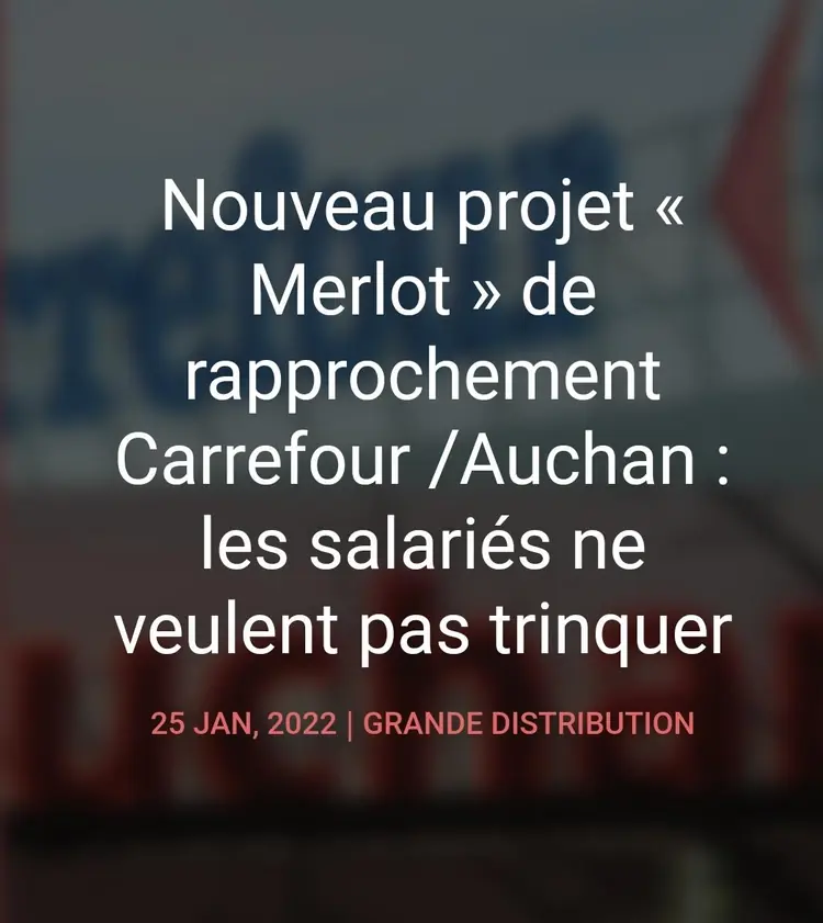 Projet ( Merlot ) Rapprochement Carrefour/Auchan. Les salariés ne veulent pas trinquer. Auchan et Carrefour cherchent, à nouveau, à créer un géant de la distribution avec la fusion de leurs 2.000 et 12 000 points de vente respectifs, dans le monde. Le scénario de prise de contrôle de Carrefour par Auchan, piloté par la banque Lazard ressurgit sous le nom de code « projet Merlot ». Les négociations qui avaient été abandonnées en novembre, n’avaient échoué que pour des divergences sur le prix de l’OPA et les modalités financières du rachat. L’objectif de cette opération est purement financier : 1,2 milliard d'euros de synergies, avec à la clé une amélioration du résultat pour les actionnaires par une augmentation significative de la dette, de la marge et un excédent brut d’exploitation annoncé à près de 9 milliards d’euros. La cuvée s’annonce donc un bon millésime pour les actionnaires, mais les salariés ne doivent pas être dupes. Derrière…